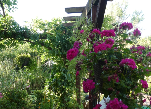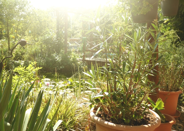 Gartenteich mit Holzbrücke, Zugang zum Garten
